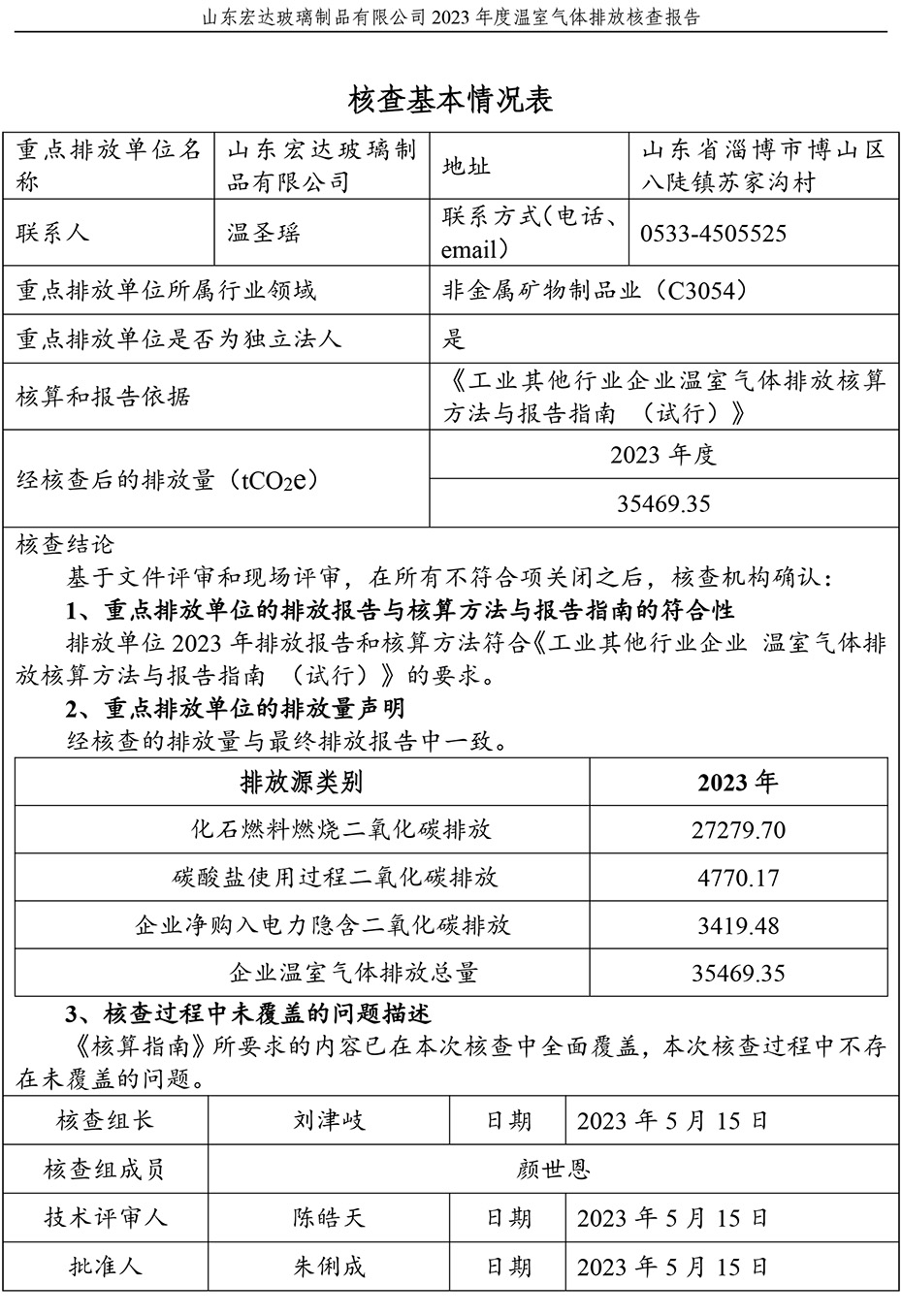 山東宏達(dá)玻璃制品有限公司2023年度溫室氣體排放核查報(bào)告